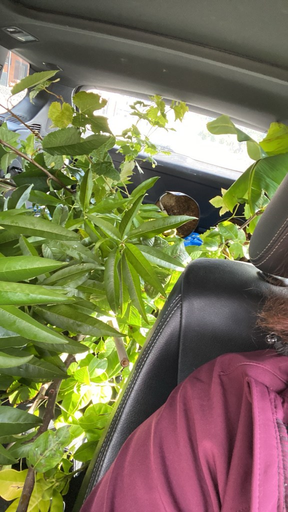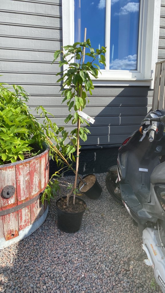 Hem kom jag med päron-, körsbär-, citron-, banan- och persikoträd. Utöver det två vinrankor för nästan inga pengar alls. Jag hade gärna köpt fler direkt, men insåg att jag faktiskt inte vet var jag ska placera dem, eller ens hur jag ska sköta dem. För att vara ärlig känner jag inte ens igen alla träd som redan finns på gården, och Google image search är allt annat än hjälpsam.