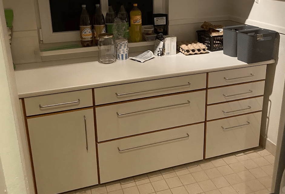 De tidigare ägarna lämnade dessutom kvar en hel del gammal inredning (bless them!), vilket ledde till ett snabbt projekt för att förbättra skafferiet. I ena uthuset hittade jag tre köksskåp som kändes för bra för att stå där och samla damm. En snabb tur till Bauhaus senare – där jag fyndade en bänkskiva för under 500 kronor – och på fyra timmar (inklusive handlandet) hade vi fått en rejäl uppgradering.
